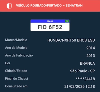 Veículo com chassi adulterado foi localizado no sábado, 21/2, durante rondas na área da Sulanca Durante rondas e abordagens de rotina, a Polícia Militar recuperou uma motocicleta com registro de roubo na tarde de sábado, 21/2, por volta das 14h20, na área da Sulanca, no Centro de Palmares, na Mata Sul de Pernambuco. De acordo com a polícia, os militares avistaram uma motocicleta NXR 150 Bros, de cor branca e placa FID-6F52, registrada no estado LER NOTÍCIA