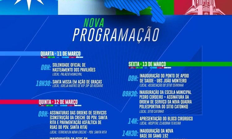 A Prefeitura de Jupi anunciou ajustes na programação de inaugurações e entregas previstas dentro das comemorações pelos 64 anos de Emancipação Política do Município. A mudança ocorreu devido a uma Agenda institucional Extraordinária da Prefeita Rivanda Freire, em Brasília, e também em razão das demandas geradas pelas recentes chuvas que atingiram o Município. Segundo a Gestão Municipal, a Comitiva de Governo cumprirá compromissos na Capital Federal em busca de novos recursos para fortalecer as ações LER NOTÍCIA
