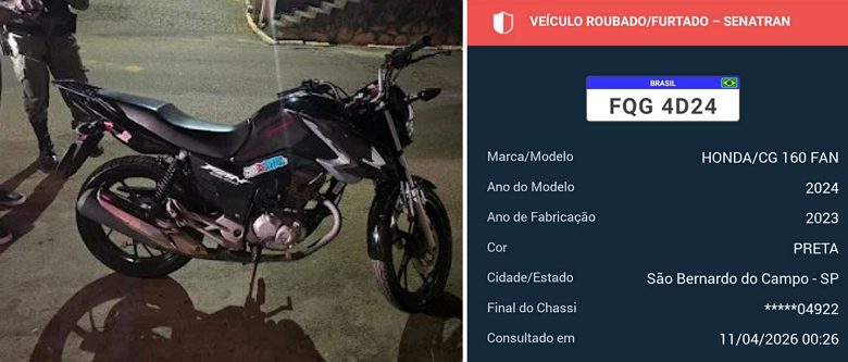 Veículo apresentava sinais de clonagem e possuía registro de roubo no estado de São Paulo Uma motocicleta com registro de roubo foi apreendida pela Polícia Militar na noite de quinta-feira, 9/4, no centro do município de São Benedito do Sul, na Mata Sul de Pernambuco. Durante rondas na localidade, o efetivo abordou o condutor de uma CG 160 Fan, de cor preta. Na revista pessoal, nada de ilícito foi encontrado. No entanto, ao verificar os LER NOTÍCIA