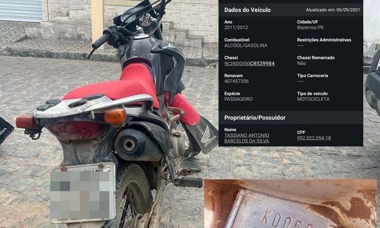 Na noite desta quarta-feira (8), a Polícia Militar apreendeu uma motocicleta com sinais de adulteração durante patrulhamento na Rua Francisco Santana, no município de Iati, no Agreste de Pernambuco. De acordo com a PM, os policiais identificaram uma motocicleta com placa da cidade de Cachoeirinha e realizaram a abordagem. Durante a verificação, foi constatado que a numeração do motor apresentava sinais de adulteração, com indícios de remarcação. Após uma análise mais detalhada, os policiais conseguiram LER NOTÍCIA
