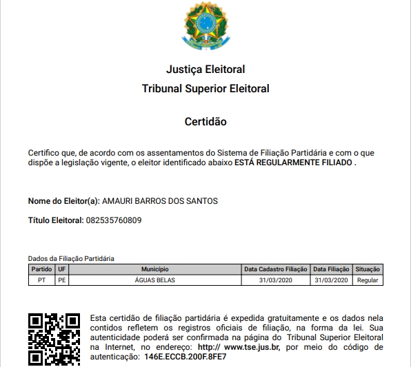 Em outro ponto, vale frisar que o próprio Amauri não tem qualquer envolvimento político com o PCdoB, tendo como presidente o ex-prefeito Genivaldo, já que o mesmo é FILIADO AO PRÓPRIO PARTIDO DOS TRABALHADORES (PT) liderado pelo prefeito que alega ser vítima de tudo isso, de acordo com a certidão de filiação, desde Março deste ano, portanto fica evidenciado, de que, além não ter havido qualquer indicio de provas que atribua qualquer conduta criminosa ao Amauri, ainda assim, este, teve sua filiação deferida pelo partido pelo qual tenta a todo custo imputar a alguém o envolvimento no suposto ato criminoso do incêndio das bandeira.