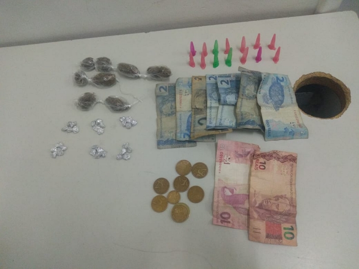 A PM abordou o infrator, encontrou com ele 8 papelotes de maconha e dentro de um frasco que ele jogou 30 pedras de crack, 14 pinos vazios utilizados para comercializar cocaína e uma quantia em dinheiro.