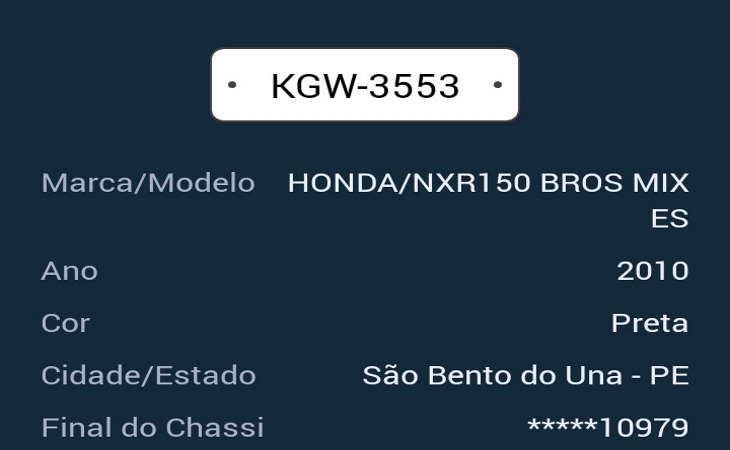 Na tarde de quinta-feira (28), foi tomada de assalto uma motocicleta modelo Bros de placa KGW-3553 na cor preta. A vítima trafegava pelo loteamento Delmiro Braga, no município de São Bento do Una, quando foi abordada por dois criminosos que portavam uma arma de fogo. Desta forma, eles anunciaram o assalto e levaram a motocicleta.