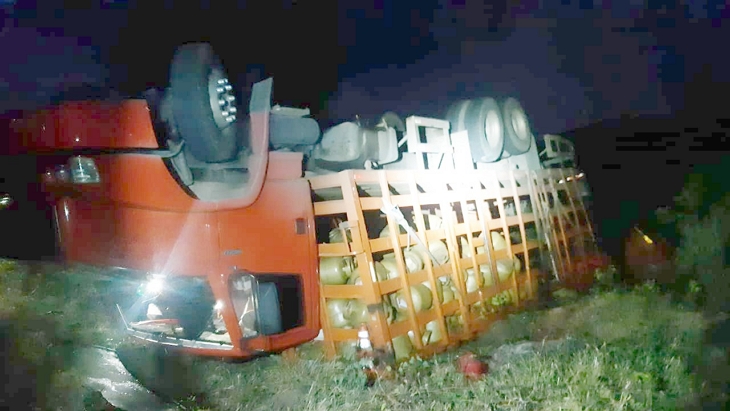 Leandro Alves dos Santos, de 34 anos, estava conduzindo um caminhão carregado de botijões de gás, quando desceu uma ladeira de ré, cruzou a pista, acessou o acostamento da contramão e capotou fora da pista.