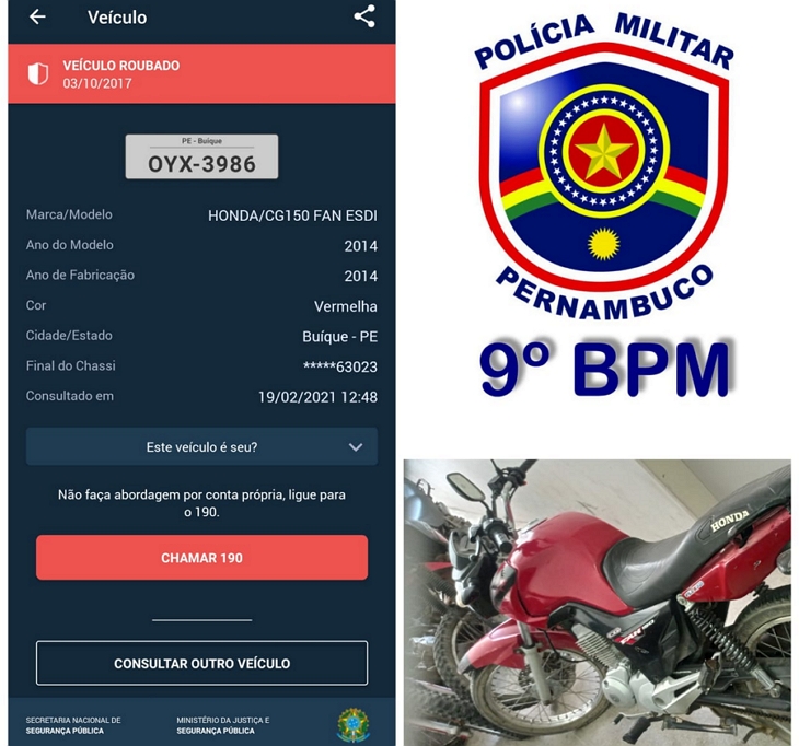 Uma moto roubada foi recuperada pela Polícia Militar na tarde desta sexta-feira (19), no município de Águas Belas.