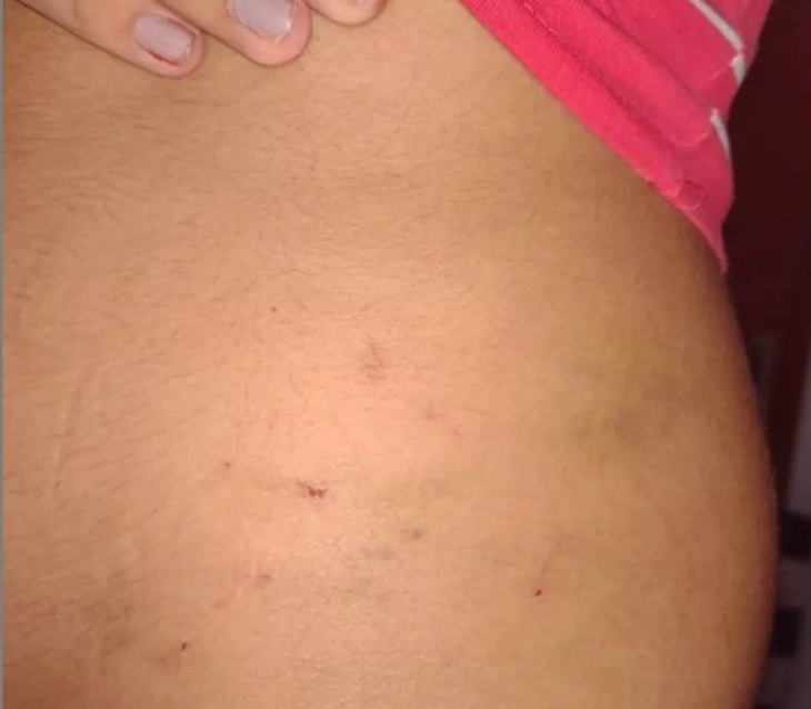 Também nas redes sociais, a adolescente publicou fotos mostrando como ficou o corpo depois das agressões sofridas. Em uma imagem, ela apresenta arranhões e marcas de pancadas na barriga.