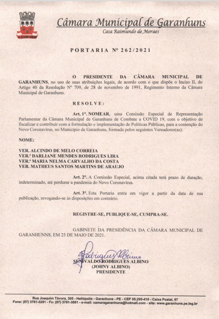 Através da Portaria nº 262/2021, o Presidente da Câmara de Garanhuns, o vereador Johny Albino (PSB), instituiu a Comissão Especial de Representação Parlamentar de Combate a COVID-19.