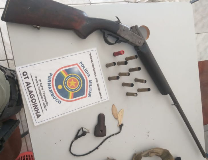 Policiais da cidade de Alagoinha apreenderam uma espingarda, calibre 32 e 11 cartuchos, além de apitos de chama e utensílios para fazer recargas.