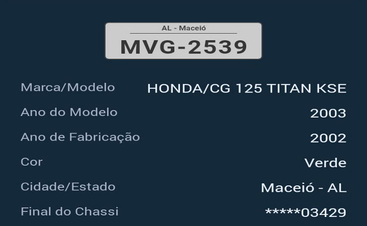 A moto tem modelo Titan, cor verde e placa MVG-2539, do Estado de Alagoas.