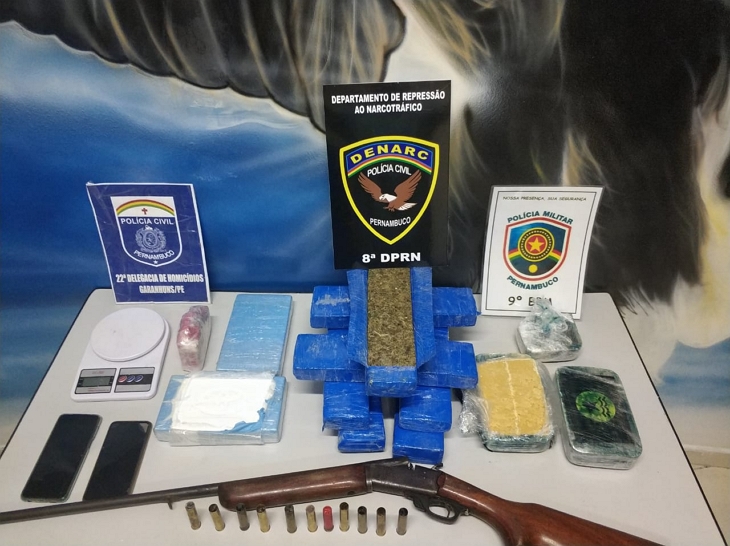 Os policiais seguiram para uma propriedade de um dos indivíduos no Sítio Garanhunzinho, na zona rural de Águas Belas, onde foram localizados no meio de um milharal, dois quilos e meio de cocaína, cinco quilos de crack e seis quilos e meio de maconha, na casa do sítio que pertence ao elemento identificado apenas por Anderson, foi entregue por ele uma espingarda calibre 32 e 11 munições do mesmo calibre, também foram apreendidos dois celulares e uma balança de precisão