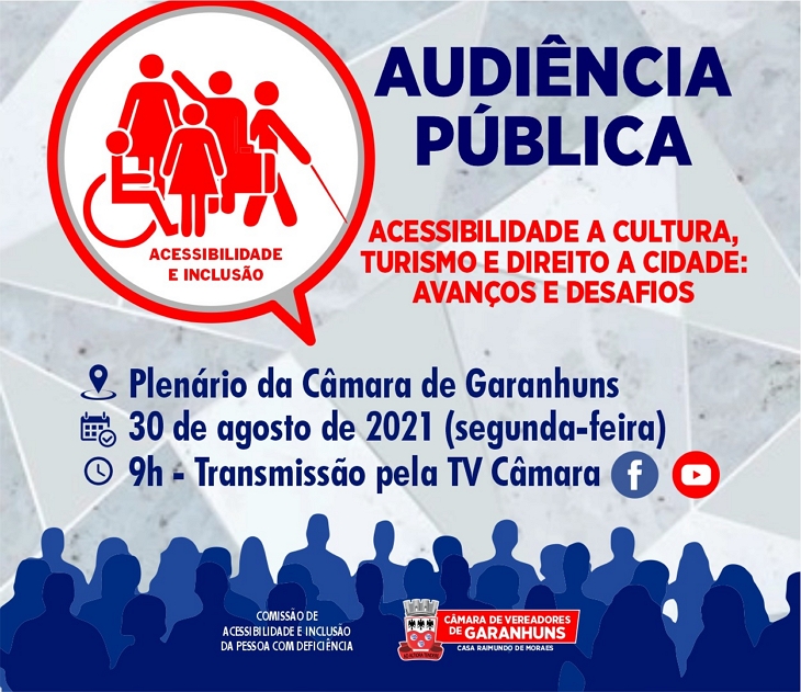 A Comissão de Acessibilidade e Inclusão da Pessoa com Deficiência da Câmara de Garanhuns promoverá a segunda, de uma série de três Audiências Públicas, com a finalidade de tratar das políticas públicas voltadas às Pessoas com Deficiência no Município.