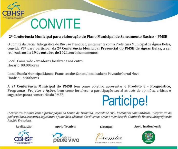 Na próxima terça-feira (19), o Comitê da Bacia Hidrográfica do Rio São Francisco e a Prefeitura de Águas Belas realizam a 2ª Conferência Municipal do Plano Municipal de Saneamento Básico (PMSB) de Águas Belas.