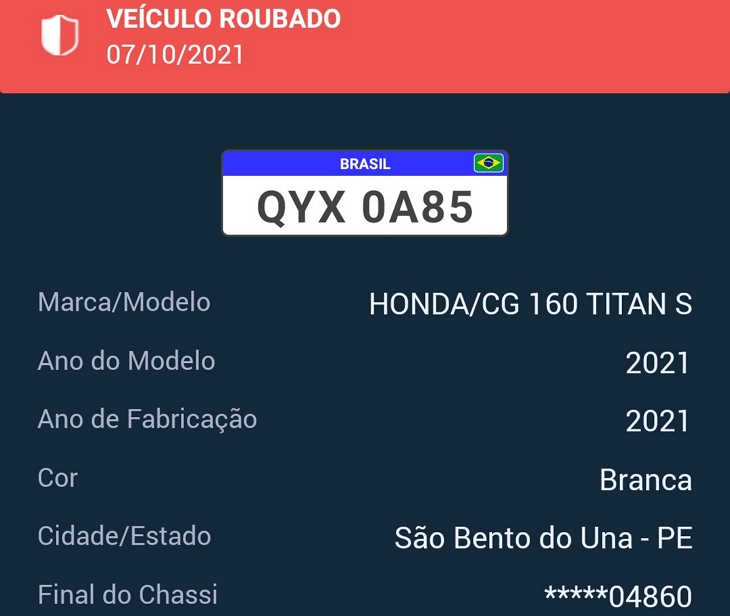 O roubo foi comunicado a polícia e a moto ainda não foi recuperada.