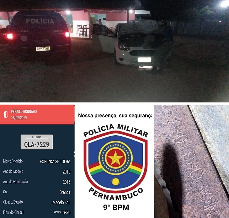 Segundo os militares, foi obtido informações que num bar, localizado às margens da BR-423 havia pessoas num veículo suspeito. Os policiais foram ao local e durante abordagem conseguiram localizar o veículo, com placa de Jaboatão dos Guararapes, o qual apresentava sinais de adulteração no chassi e continha queixa de roubo.