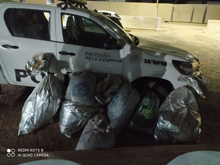 O Batalhão mobilizou equipes da guarnição tática, do GATI e da Patrulha Rural para realizar incursões na caatinga, na localidade indicada. Ao perceber a chegada do efetivo, um grupo abriu fuga pela vegetação. Neste momento, foram encontrados 110kg de maconha, armazenados em oito sacos e escondidos no mato, envoltos por uma lona preta.