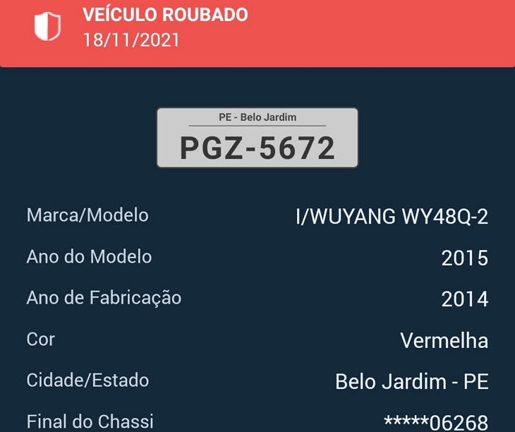Uma moto Wuyang, cor vermelha, placa PGZ-5672, foi furtada na noite desta quinta-feira (18), no município de Belo Jardim, no Agreste de Pernambuco.