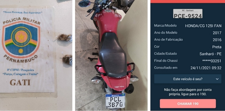 Policiais do GATI apreenderam duas motocicletas e duas porções de maconha que estavam com um adolescente de 17 anos, indivíduo bastante conhecido na localidade, por ser apontado na prática de diversos delitos ocorridos na região de Pesqueira/PE. As apreensões se deram por volta das 09h30 de quarta-feira, 24, durante a realização da Operação Abordagem imposta pela 8ª CIPM (Companhia Independente de Polícia Militar).