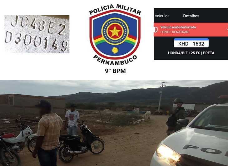 Uma motocicleta modelo Biz de placa KHD-1632, na cor preta, foi apreendida pela Polícia Militar no sábado, 06, na PE-300, no município de Águas Belas. O veículo estava com queixa de roubo e apresentava adulterações na numeração do chassi.