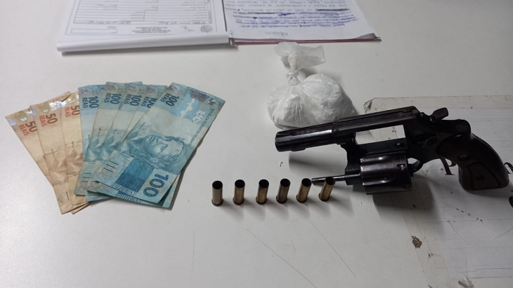 Com o suspeito foi apreendido um revólver calibre 38 com seis munições deflagradas e a quantia de 750 reais e dentro do carro foi localizado um pacote de cocaína pesando 200 gramas da droga. A suspeita é de que o jovem estivesse envolvido com o tráfico de drogas e que estivesse indo realizar alguma entrega.