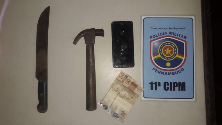 Ainda foi apreendida a faca usada no crime, um martelo, uma quantia em dinheiro e roupas sujas de sangue.