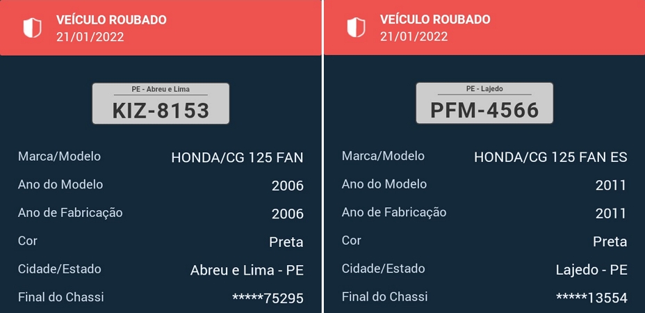 Uma das motocicletas furtada ocorreu nas proximidades de uma residência no Sítio Caracol. Ela estava estacionada enquanto o proprietário realizava trabalhos na área rural. O veículo furtado tem placa KIZ-8153, cor preta e modelo Fan 125.