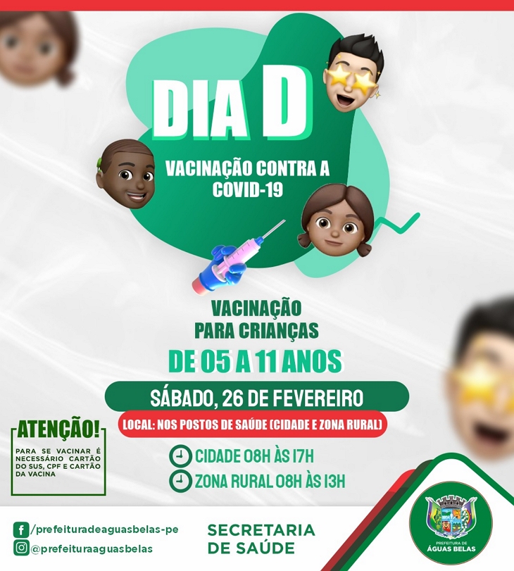 A Prefeitura de Águas Belas irá realizar neste sábado (26), por meio da Secretaria de Saúde, o dia D da vacinação contra Covid-19 para crianças de 5 a 11 anos.