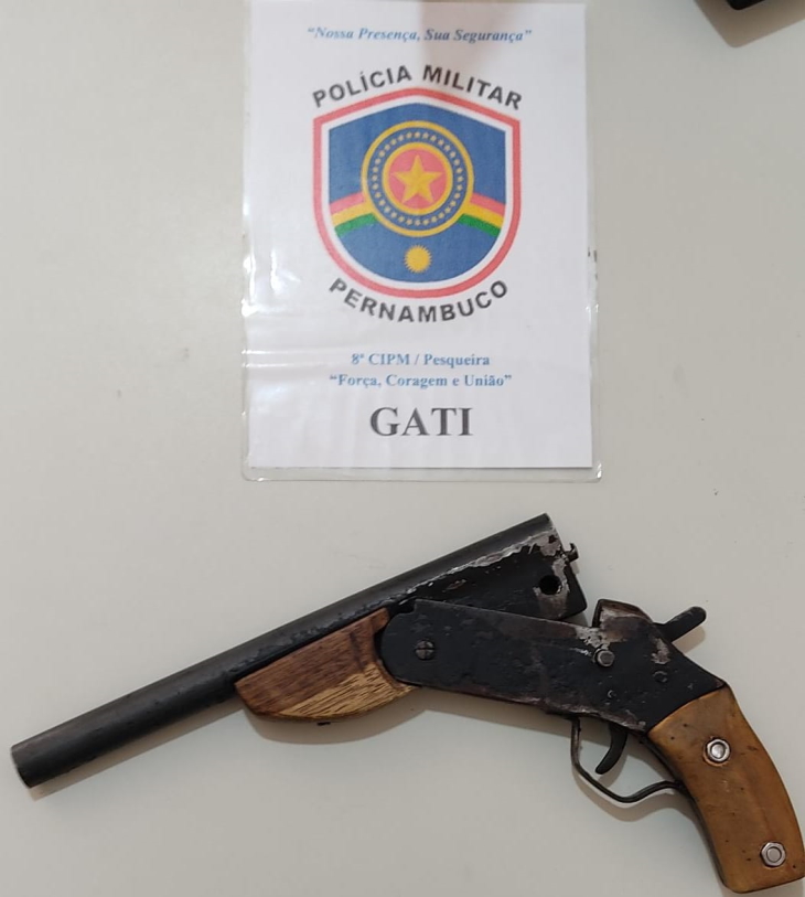 Policiais do GATI apreenderam em Pesqueira uma espingarda calibre 12 de cano curto. A arma foi localizada durante diligências após um assalto no bairro do Prado, na manhã desta segunda-feira, 7, tendo como vítima uma mulher que teve a casa invadida por marginais.