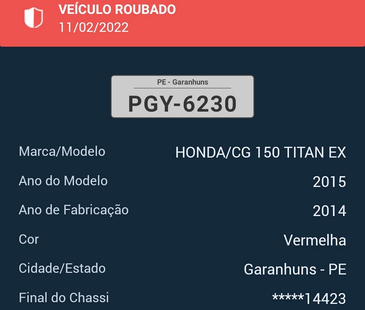 A vítima estava na porta da casa que mora e foi abordada por dois assaltantes armados, os criminosos tomaram a moto e sua carteira contendo dinheiro e documentos, o roubo da moto Honda CG-150, cor vermelha, placa PGY-6230 já foi comunicado a polícia