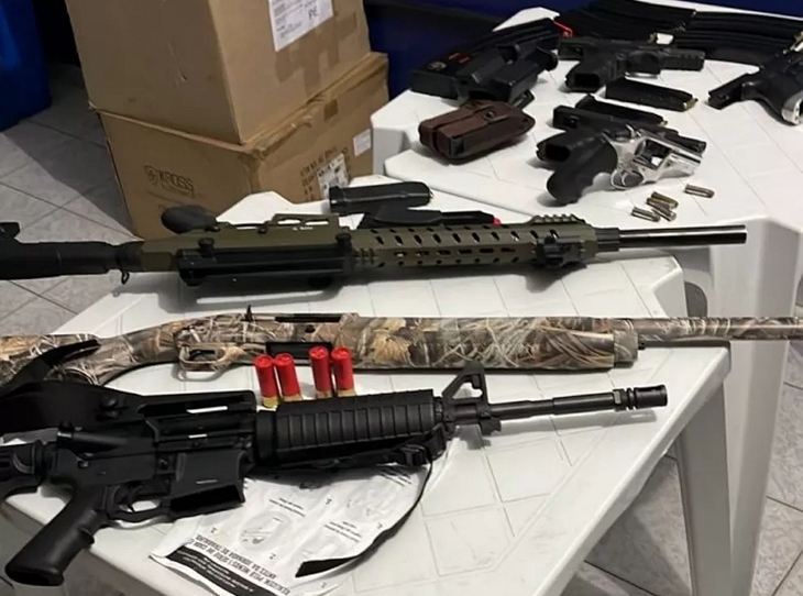 De acordo com PRF, no veículo foram encontrados duas espingardas calibre 12 com 26 munições; um fuzil calibre 223/.556 com 117 munições; duas pistolas calibre 9mm com 64 munições; uma pistola calibre.40 com 10 munições; uma pistola calibre 380 com 28 munições; um revólver calibre 38 com cinco munições; e duas armas brancas.