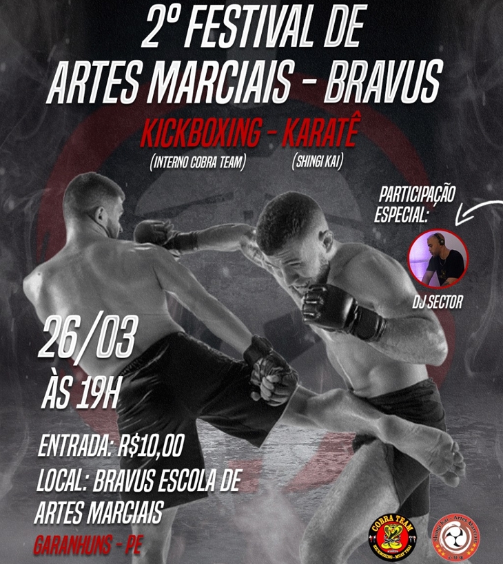 Neste sábado dia 26, às 19 horas, a Escola de Artes Marciais BRAVUS irá realizar o Segundo Festival de Artes Marciais.