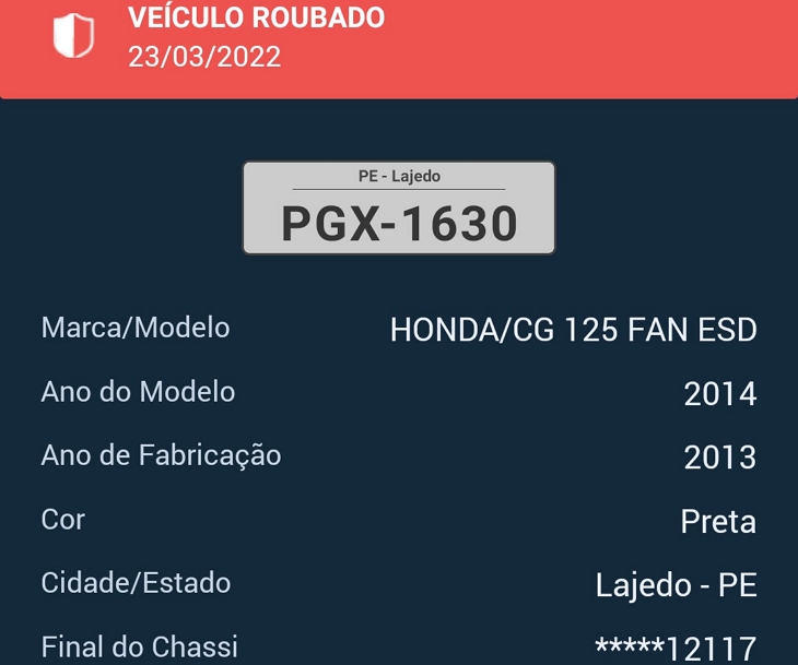 Uma moto roubada foi encontrada na tarde desta quarta-feira (30), nas proximidades da Cadeia Pública, no município de Lajedo, no Agreste.