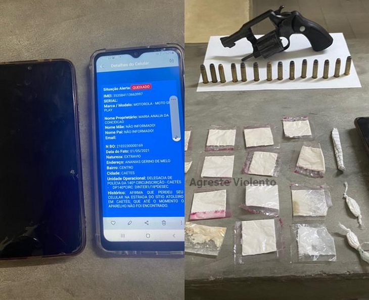As drogas estavam em cima de uma mesa onde estavam alguns elementos, também foi apreendido um revólver calibre 38 com várias munições, celulares com queixa de roubo e três motos também com queixa de roubo.