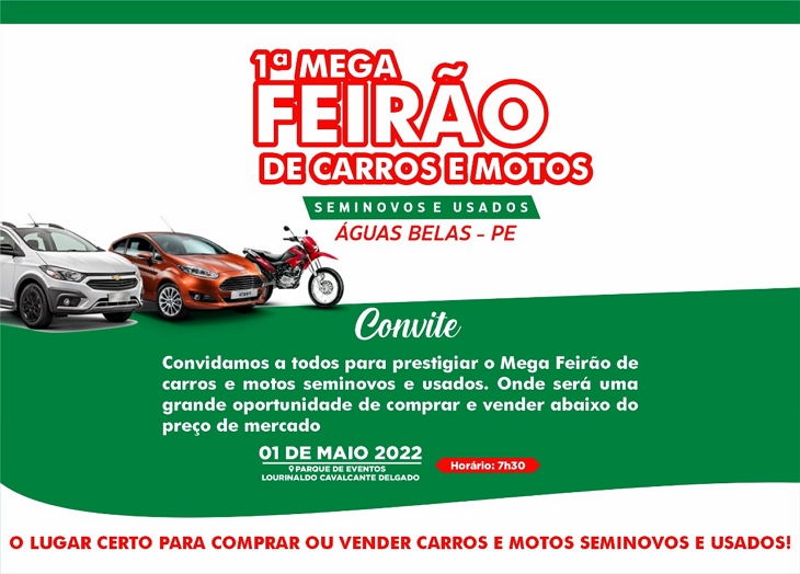 Está pensando em comprar um carro ou vender sua moto? Essa novidade é para você! Vem aí o 1º Mega Feirão de Carros e Motos Seminovos e Usados de Águas Belas, no Agreste pernambucano.