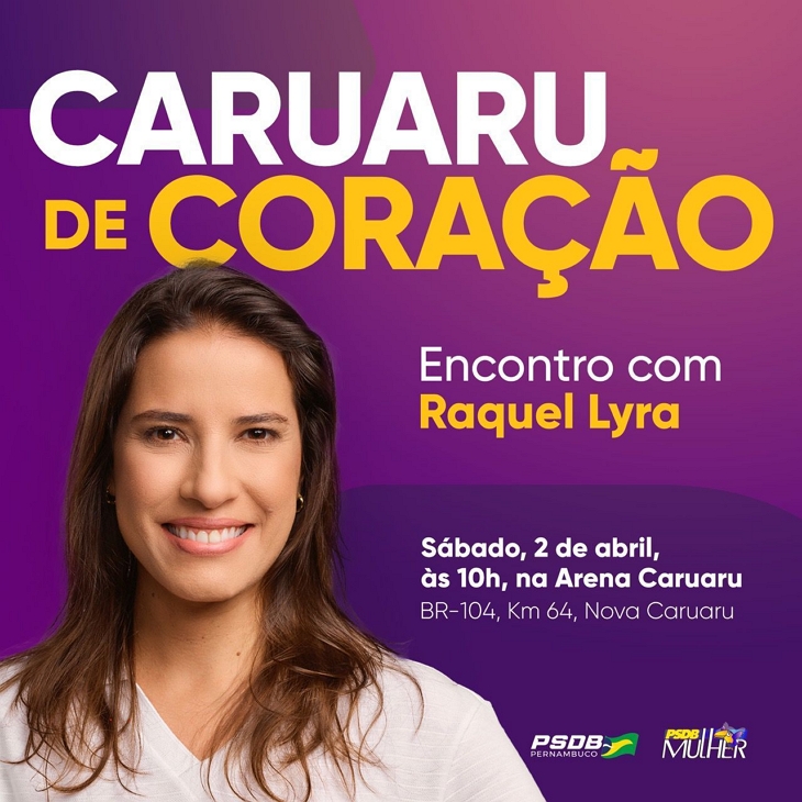 Nesse ritmo, Débora está convidando amigos, aliados, lideranças e população do agreste para estarem presentes no ato de lançamento da pré-candidatura de Raquel Lyra, a ser realizado neste sábado dia 02 de Abril, as 10 horas da manhã na Arena Caruaru.