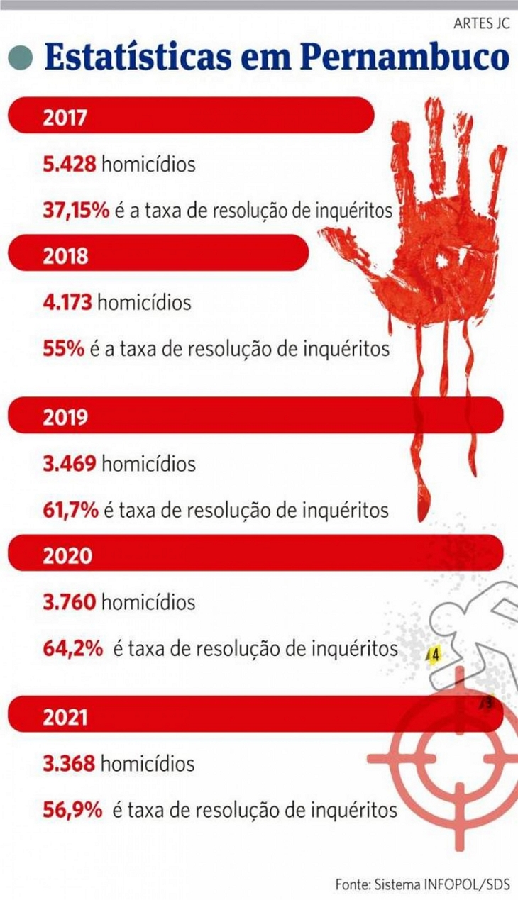 Em nota, a Polícia Civil afirmou que tem priorizado as investigações de homicídios no Estado. “Ações adotadas em 2017, quando o Estado iniciou a aferição desse indicador, fizeram com que Pernambuco ultrapassasse, nos anos seguintes, a casa dos 64% de resolução. A meta é superar essa taxa a cada ano, reduzindo a impunidade, prevenindo crimes e trazendo conforto às famílias das vítimas”, pontuou a nota.