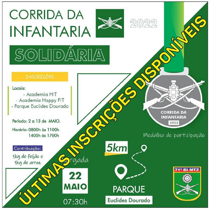 Dentro das comemorações da Semana da Infantaria, o 71º BI Mtz, Batalhão do Exército Brasileiro sediado em Garanhuns, promoverá no próximo dia 22 de maio, a Corrida da Infantaria 2022. Trata-se de uma prova de pedestrianismo, com percurso de 5km pelas principais ruas da Cidade, cuja finalidade é ajudar ao próximo.