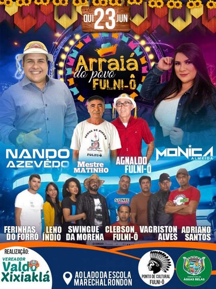 22h – Arraiá do Povo Fulni-ô, na aldeia, com Mônica Almeida, Nando Azevedo, Mestre Matinho, Agnaldo Fulni-ô e muito mais.