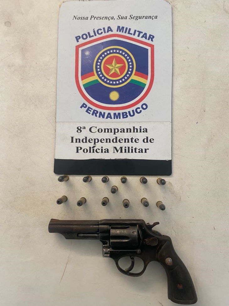 Policiais militares da 8ª CIPM apreenderam um revólver calibre 38 com 13 munições que estava com um elemento suspeito de agredir um idoso na cidade de Pesqueira/PE.