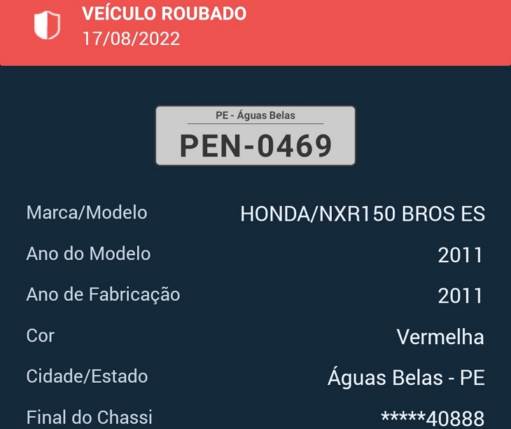 Uma motocicleta Honda Bros, cor vermelha, placa PEN-0469, foi furtada na noite desta terça-feira (16), no município de São Bento do Una, no Agreste de Pernambuco.