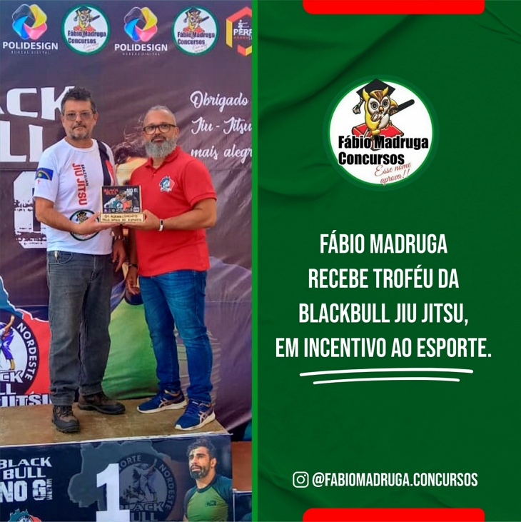 A empresa Fábio Madruga Concursos dirigida pelo professor Fábio Madruga, recebeu no último domingo 28 de agosto de 2022 das mãos do diretor do evento (BLACKBULL JIU JITSU) o troféu de reconhecimento aos investimentos feitos pelo esporte.