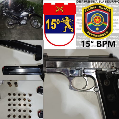 Conforme a polícia, diante das denúncias, o efetivo localizou os suspeitos e deu ordem de parada, porém eles empreenderam fuga, tendo um dos condutores perdido o controle e caído juntamente com o garupa. O condutor da motocicleta, identificado como P.A.A.C. 37 anos, apresentava sinais de embriaguez alcoólica e tentou se desfazer de uma pistola cal. 380, com 19 munições intactas. A mulher que estava na garupa, identificada como R.M.S.M. 27 anos, também tentou se desfazer de uma bolsa com 04 munições cal. 38, intactas.