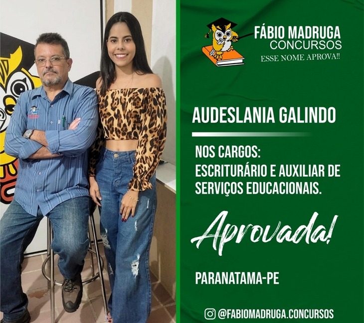 A pouco foi comunicado pela empresa Fábio Madruga Concursos a aprovação de Audeslania Galindo no Concurso da Secretária de Educação e Esportes (SEE) no cargo de assistente administrativo educacional, mas não parou por aí, a aluna recentemente também confirmou duas aprovações no concurso de Paranatama, os cargos são: Escriturário e Auxiliar de Serviços Educacionais.