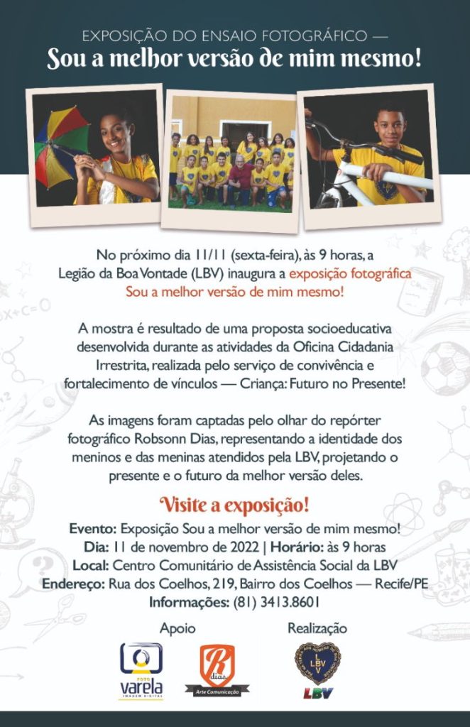 As crianças e adolescentes amparadas pelo serviço de convivência e fortalecimento de vínculos mantido pela Legião da Boa Vontade (LBV), convidam a população Recifense, para a abertura da exposição fotográfica “Sou a melhor versão de mim mesmo”, nesta sexta-feira (11/11), às 9h, em sua Unidade nos Coelhos. A exposição apresenta o resultado de uma proposta socioeducativa desenvolvida na oficina de Cidadania Irrestrita, sobre a identidade dos integrantes do serviço Criança: Futuro no Presente!