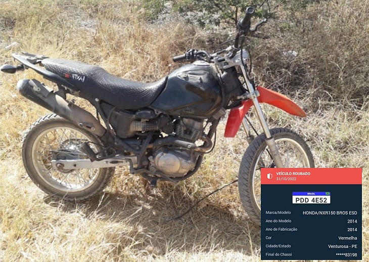Conforme os militares, foi obtido informações de populares que havia uma motocicleta abandonada às margens da rodovia BR-423, com a chegada do policiamento ao local indicado foi constatado as informações anteriores. A moto de placa PDD-4E52, modelo NXR 150 Bros na cor vermelha estava com queixa de roubo.