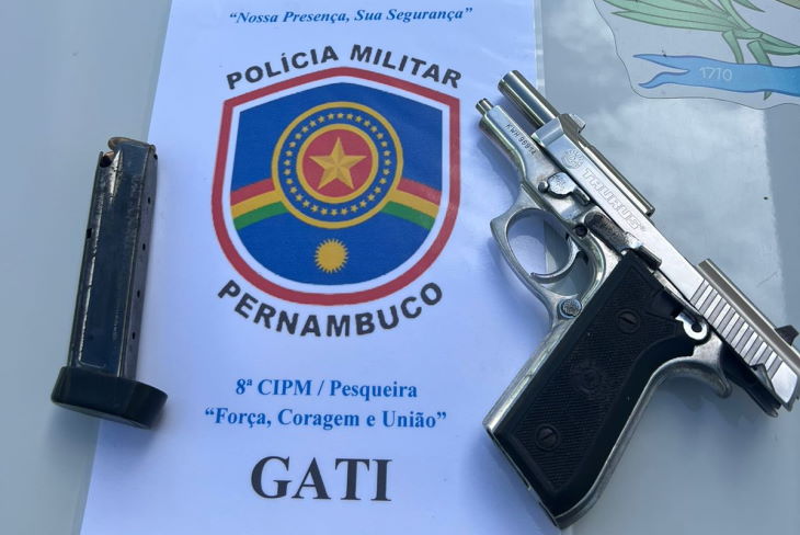 Policiais do GATI apreenderam uma pistola calibre 380 com 15 munições dentro de um restaurante na manhã deste sábado, 26, na cidade de Pesqueira/PE. Três elementos bebiam no local quando um policial percebeu que um dos indivíduos estava armado.