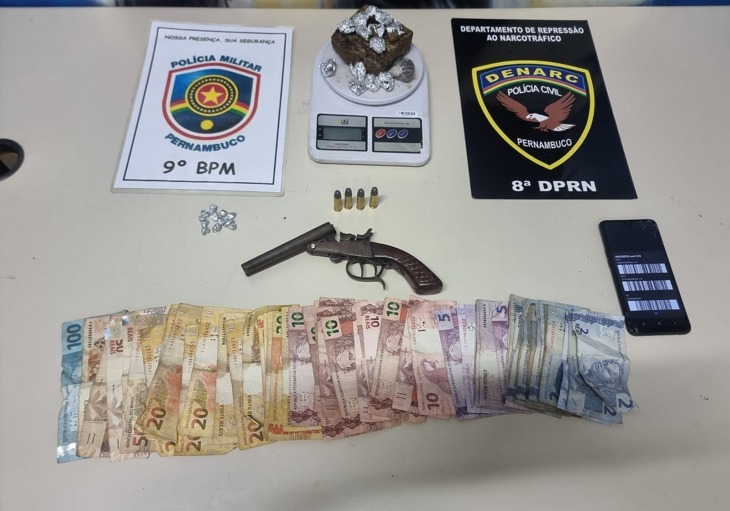 Na bolsa estava uma garrucha e drogas, na casa foram encontradas mais drogas, uma balança de precisão e outra quantia em dinheiro.