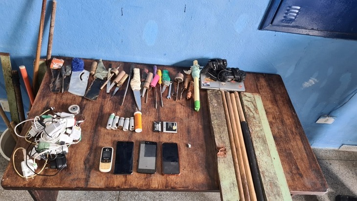 A Polícia Militar e Polícia Penal, participaram da revista que resultou na apreensão de quatro celulares, duas baterias, dezesseis carregadores, um vídeo game com dois controles, vinte e cinco chunchos, além de outros materiais de uso proibido na unidade.
