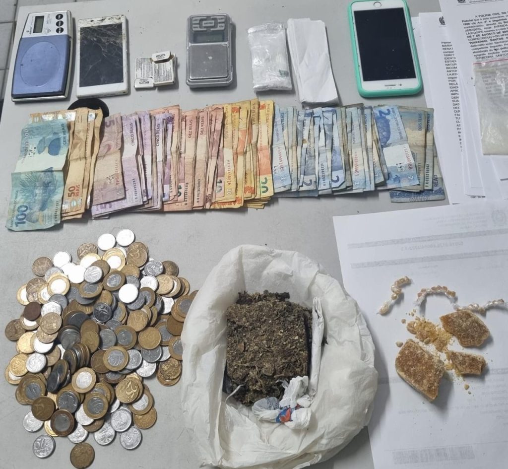Na casa foram encontradas 73 gramas de crack, 123 gramas de maconha, dois celulares, sacolas para embalo de drogas, três caixas de lâminas, papeis para consumo de drogas e R$ 1.312,00 reais.