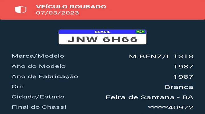 Dois elementos armados tomaram um caminhão de assalto na tarde de segunda-feira, 6, num posto de combustível na cidade de Lajedo/PE. O veículo roubado tem modelo M. Benz L 1318, cor branca, placa JNW-6H66 e estava carregado com produtos de PVC.