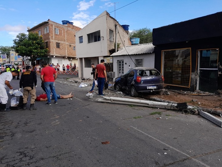 A suspeita é de que o veículo estava em alta velocidade no momento da colisão e, mesmo após colidir no poste, só parou em uma calçada da avenida. A porta do veículo foi arrancada na colisão e parte da calçada foi danificada.